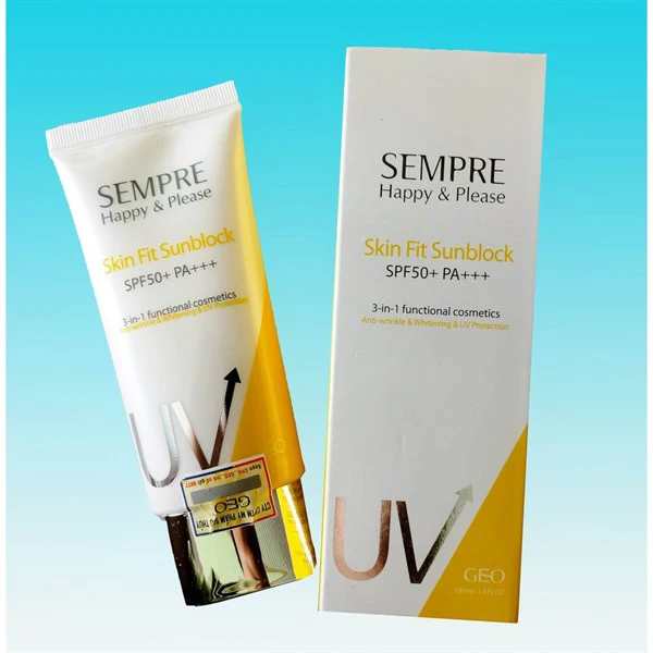 Kem chống nắng Geo Sempre Happy & Please skin fit sun block SPF/ 50 PA +++ là sản phẩm chống nắng độc đáo kết hợp khả năng bảo vệ da với công dụng dưỡng da, làm trắng. Chỉ số chống nắng cao, ngăn ngừa hữu hiệu tác động của các tia có hại trong ánh nắng mặt trời gây tổn thương da, đen da, sạm nám…